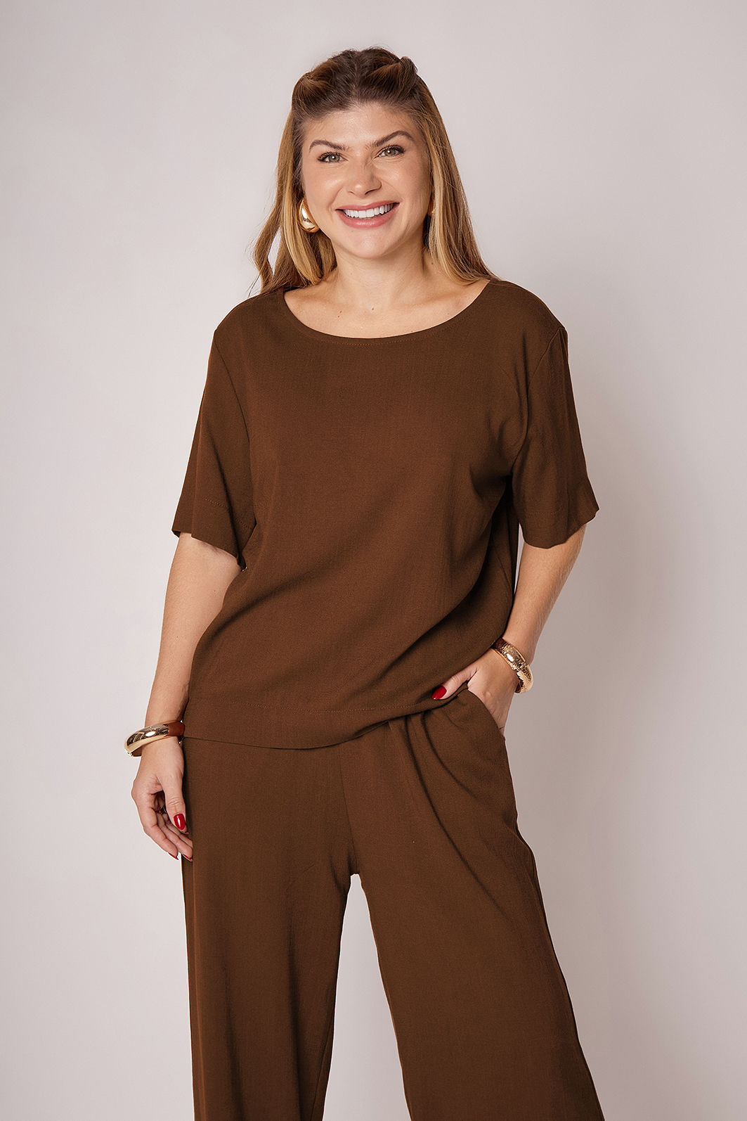 Com uma estética minimalista e toque de elegância, a Blusa Chloe é confeccionada em tecido plano de viscose com elastano — leve, respirável e com textura que remete ao linho. A peça traz um caimento confortável com shape levemente ajustado ao corpo, proporcionando sofisticação com liberdade de movimento.