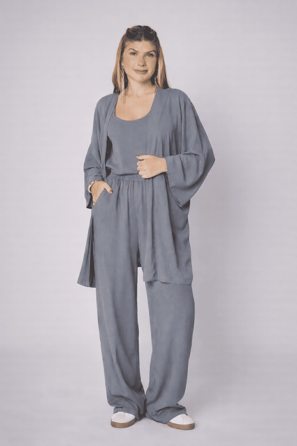Caimento fluido e sofisticado: A modelagem ampla da calça, a leveza da regata e o kimono com mangas amplas tipo sino criam uma silhueta moderna, alongada e cheia de movimento.