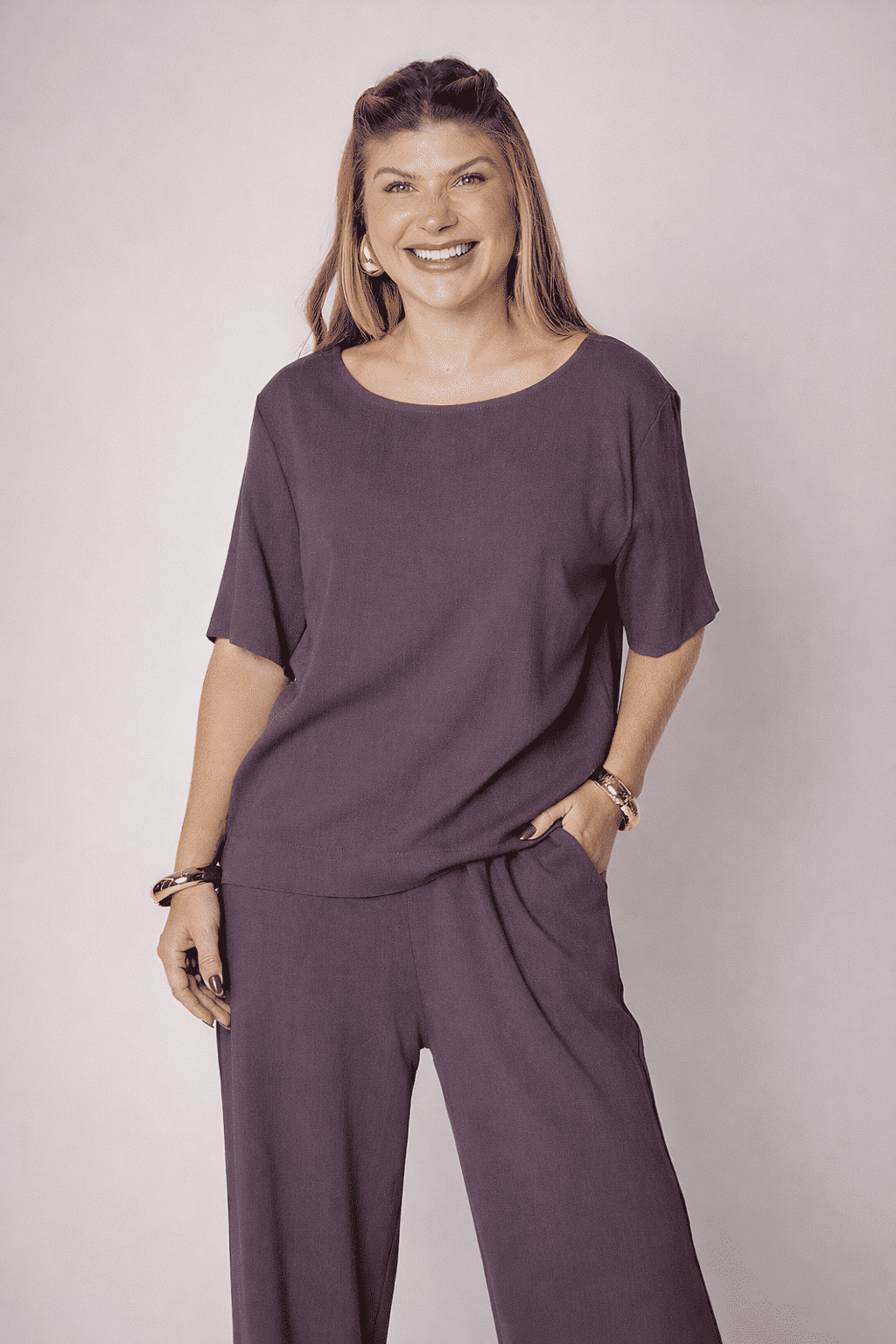 Caimento que valoriza: A blusa possui modelagem levemente solta com mangas amplas e delicadas, enquanto a calça de corte reto alonga a silhueta, equilibrando perfeitamente o look.