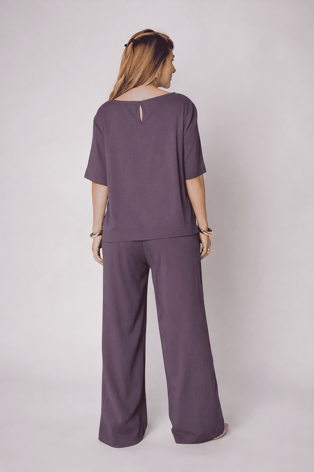 Elegância sem esforço: A combinação do caimento fluido da blusa com a modelagem ampla da calça cria um visual sofisticado, moderno e extremamente confortável.