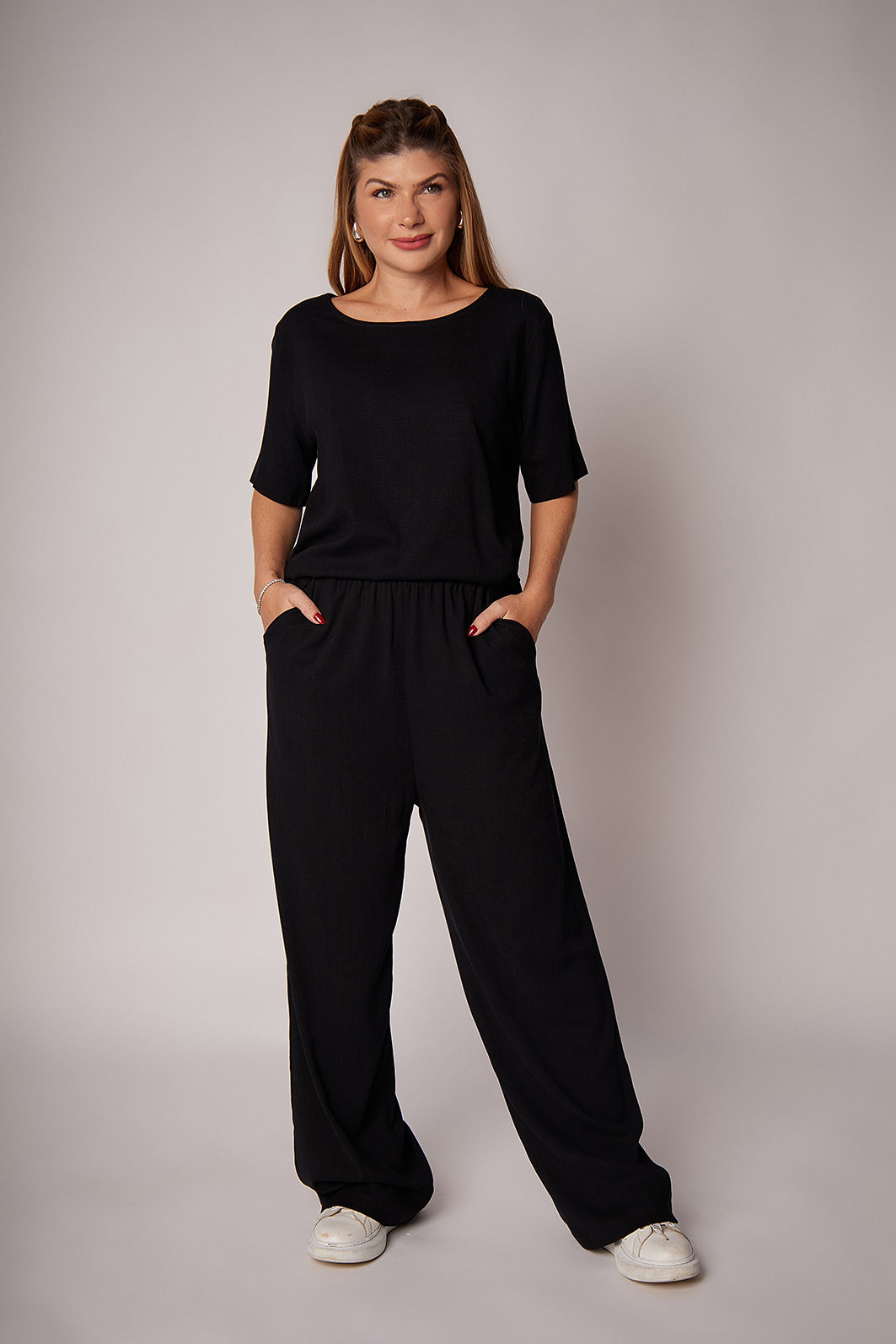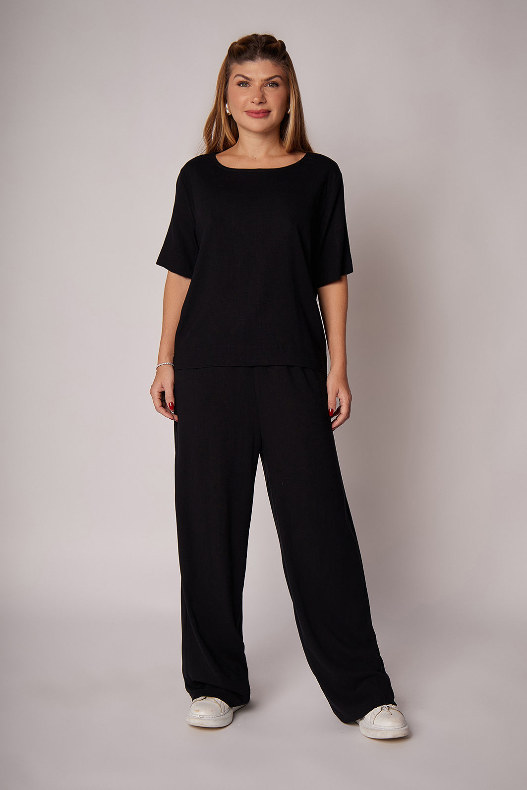 Modelagem & detalhes: Calça com corte reto clássico e atemporal, com elástico na cintura para ajuste prático e confortável. Possui bolsos funcionais e modelagem mais soltinha, que une estilo descontraído e comodidade. Blusa shape levemente ajustado ao corpo, decote redondo com detalhe em gota nas costas e mangas de comprimento intermediário, com estrutura sutilmente ampla. Um equilíbrio entre sofisticação e leveza.