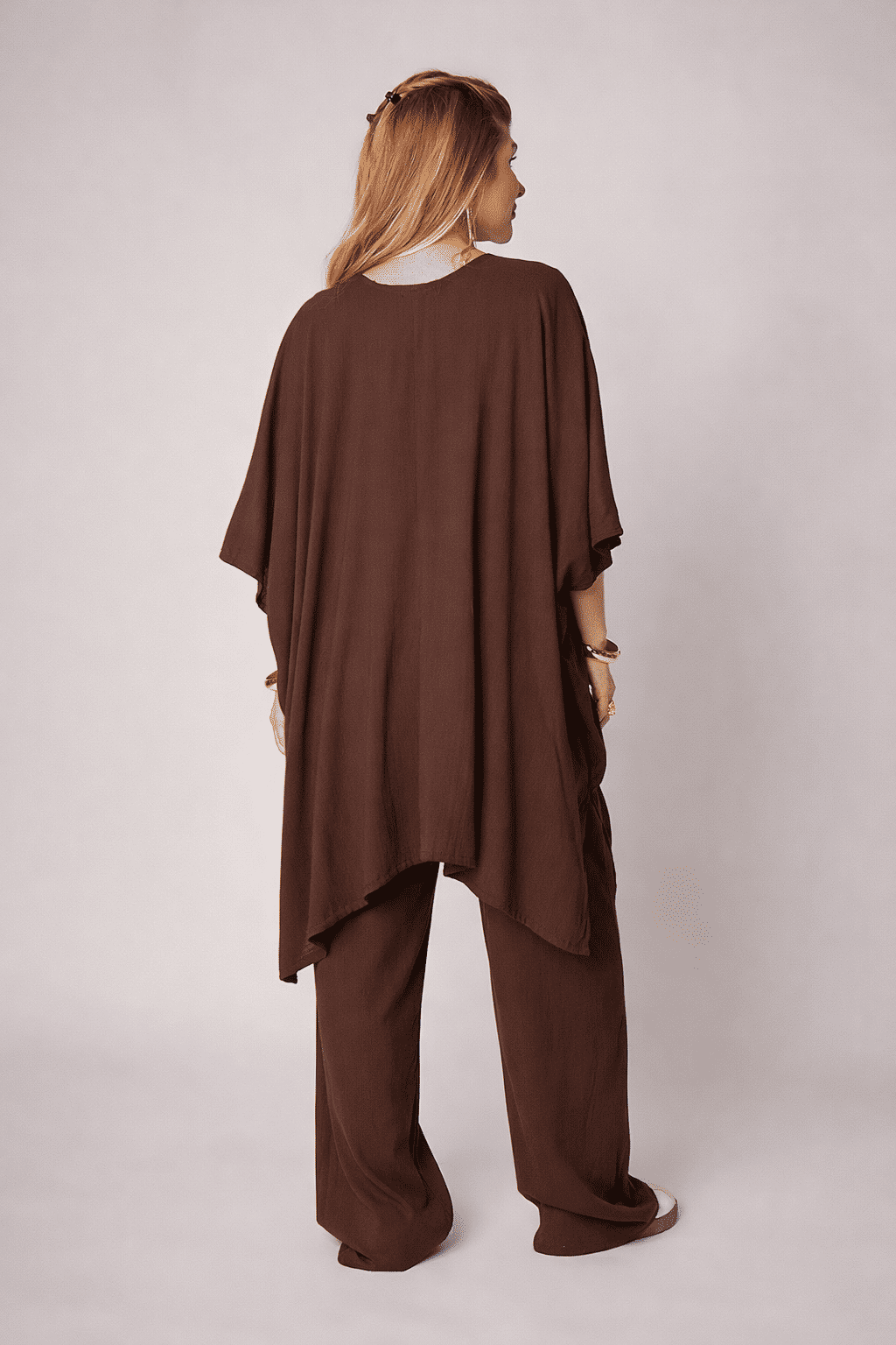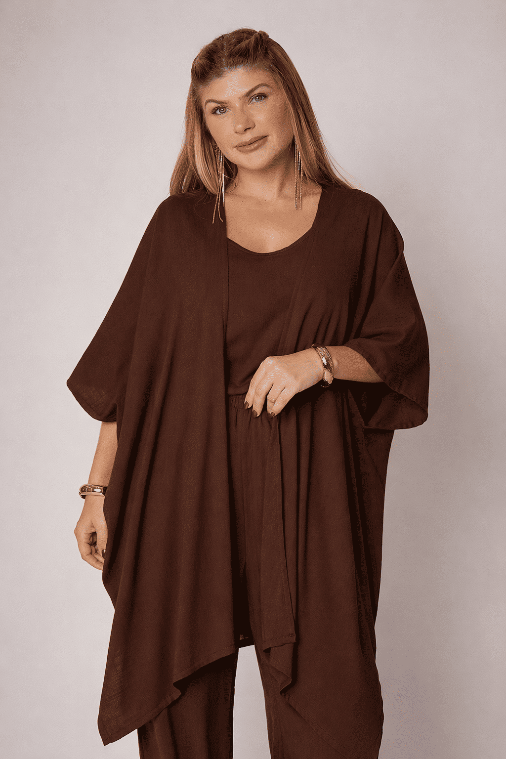 Caimento fluido e elegante: A modelagem ampla da calça, a leveza da regata e o kimono de corte reto criam uma silhueta sofisticada, moderna e confortável.