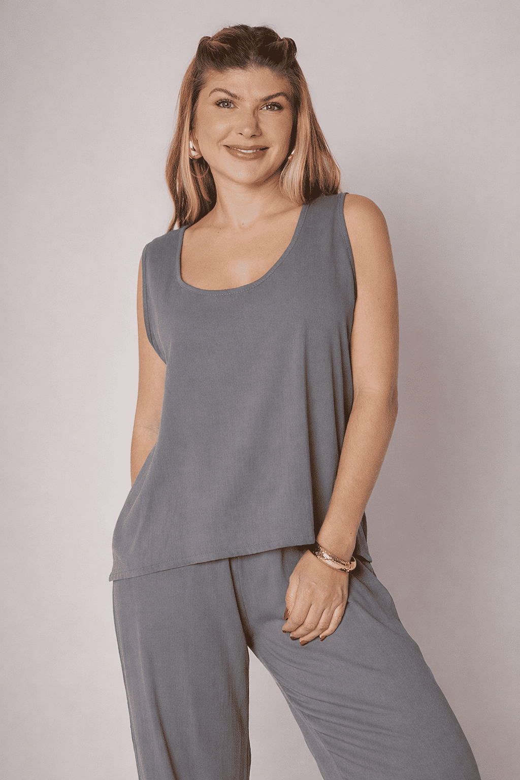 Caimento leve e elegante: A combinação da regata com modelagem ampla e da calça de corte reto cria uma silhueta equilibrada, alongada e moderna, valorizando o corpo com naturalidade.