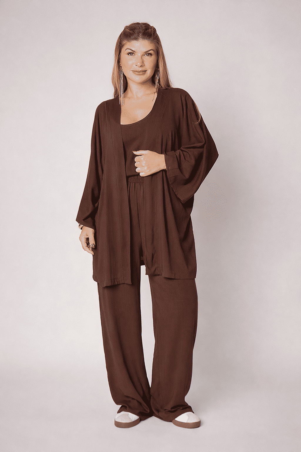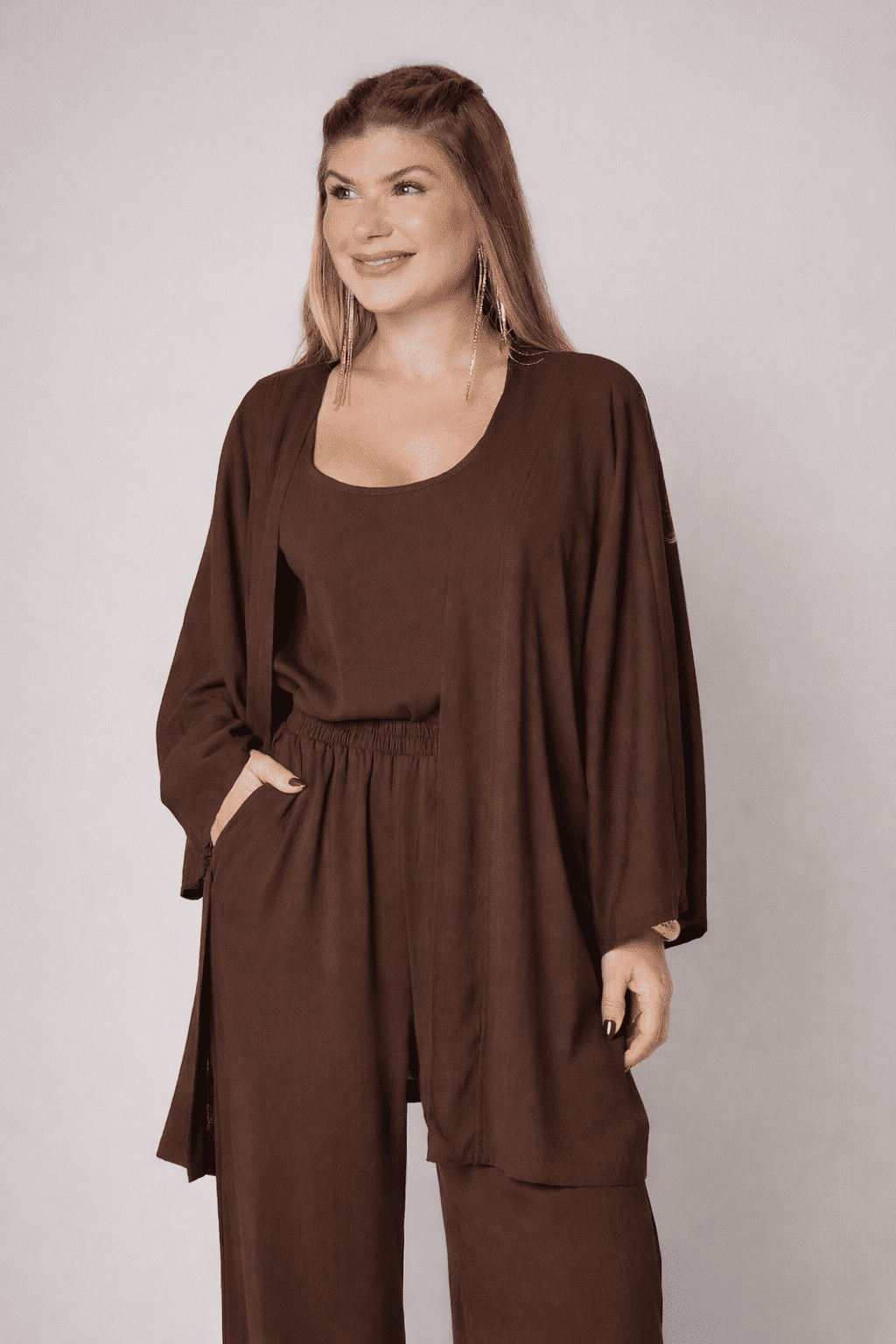 O Kimono Aline é aquela peça curinga que transforma seu visual com facilidade e elegância. Com uma modelagem ampla e fluida, ele une o conforto que você busca com um toque de sofisticação minimalista que está super em alta.