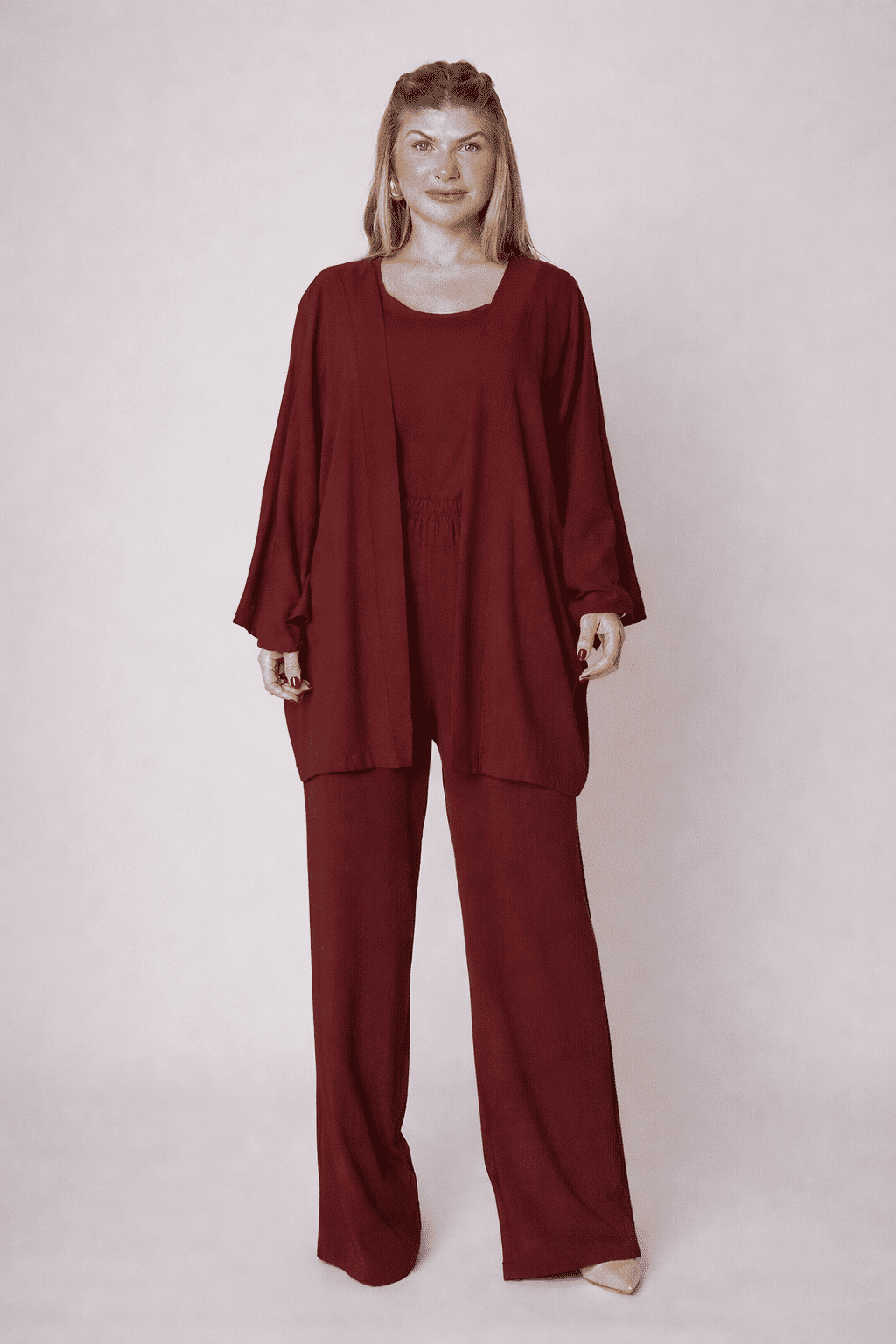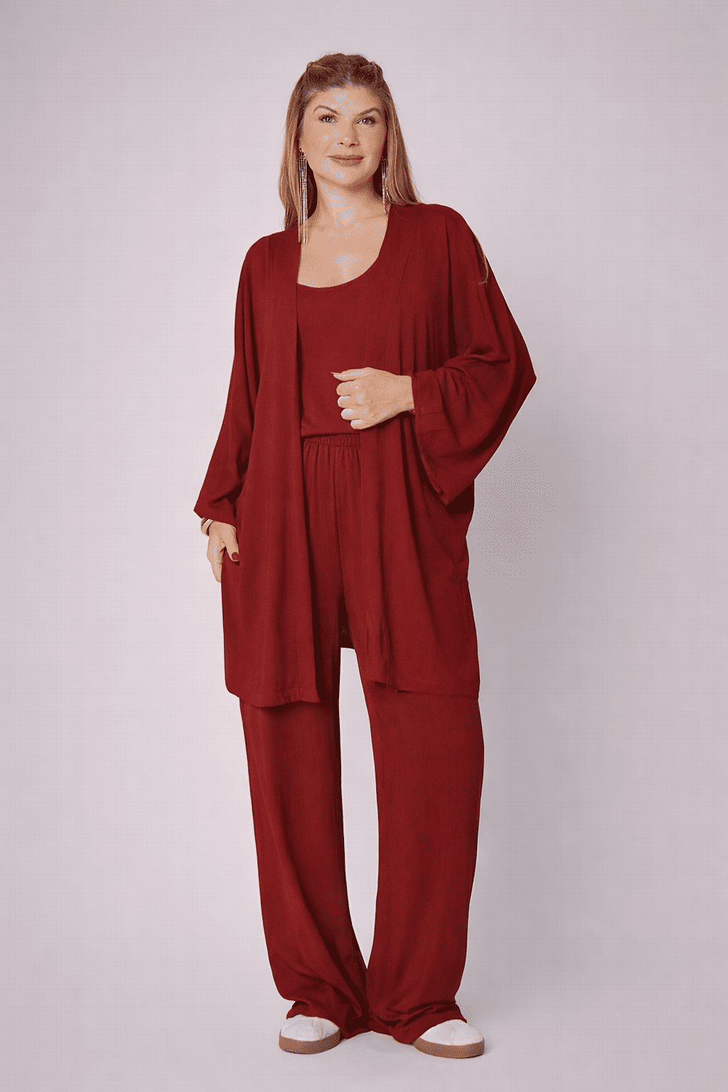 O Kimono Aline é aquela peça curinga que transforma seu visual com facilidade e elegância. Com uma modelagem ampla e fluida, ele une o conforto que você busca com um toque de sofisticação minimalista que está super em alta.