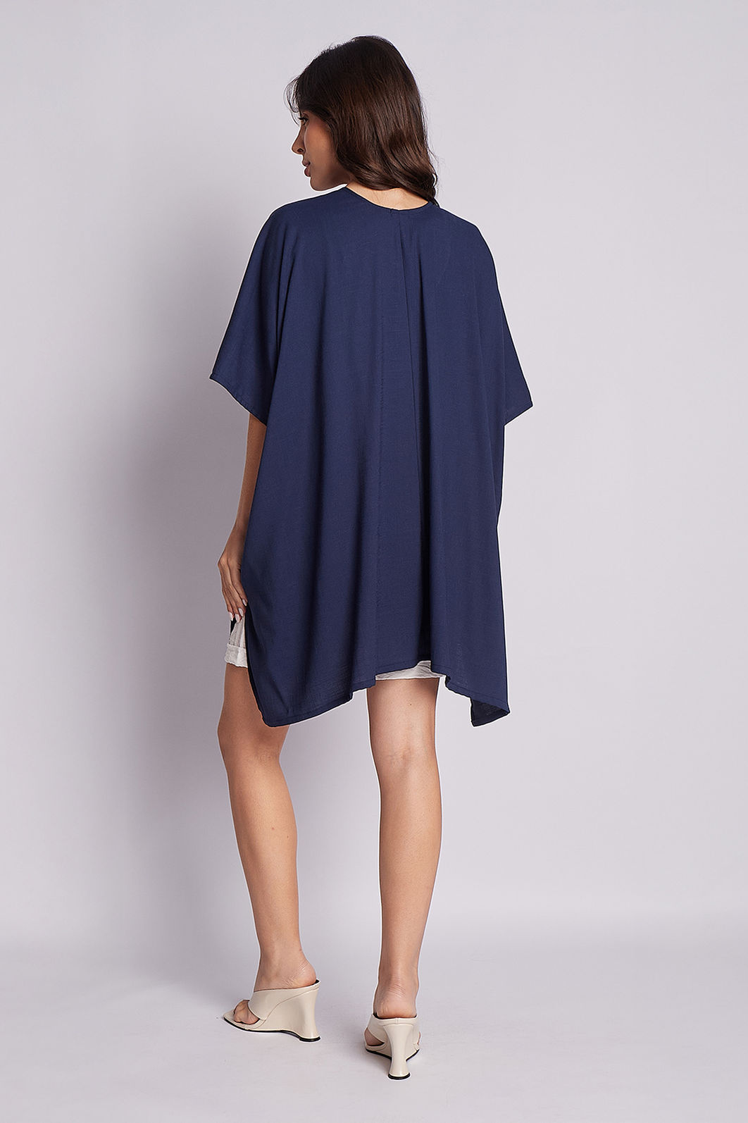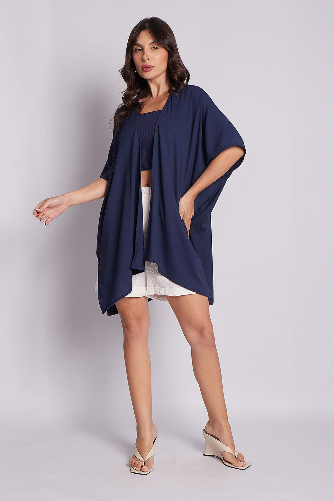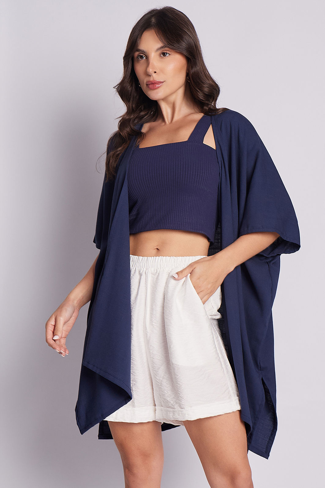 Kimono curto e amplo, com corte reto, perfeito para compor looks modernos e despojados com um toque de elegância.
