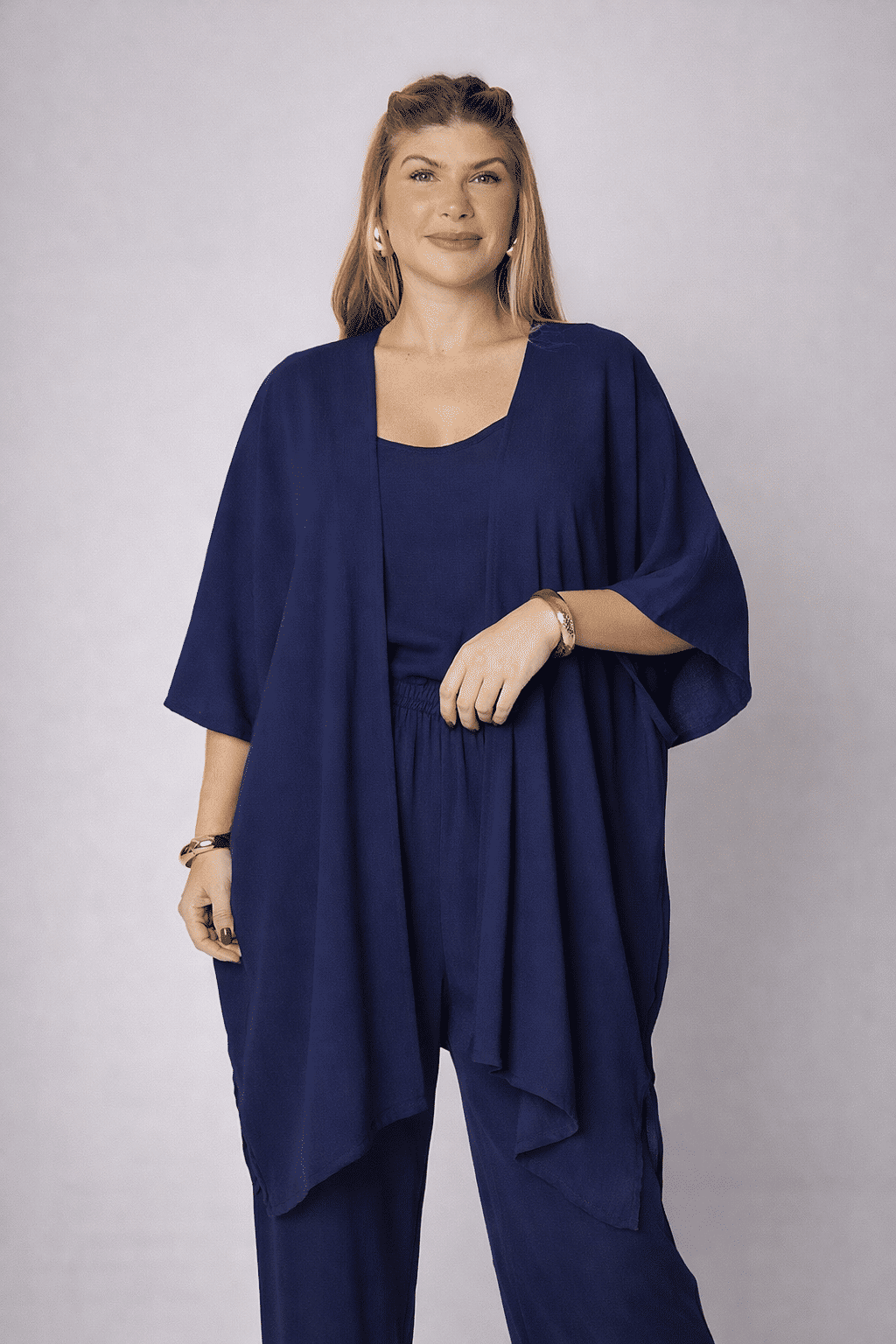 Modelagem: Sua silhueta ampla e fluida transmite leveza e sofisticação, enquanto o corte reto adiciona modernidade ao visual.