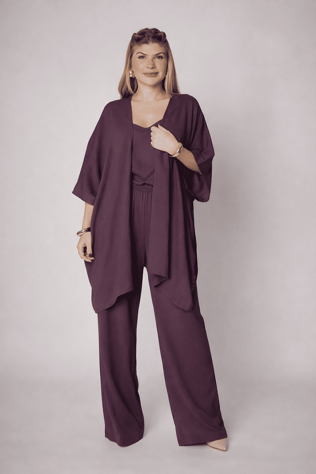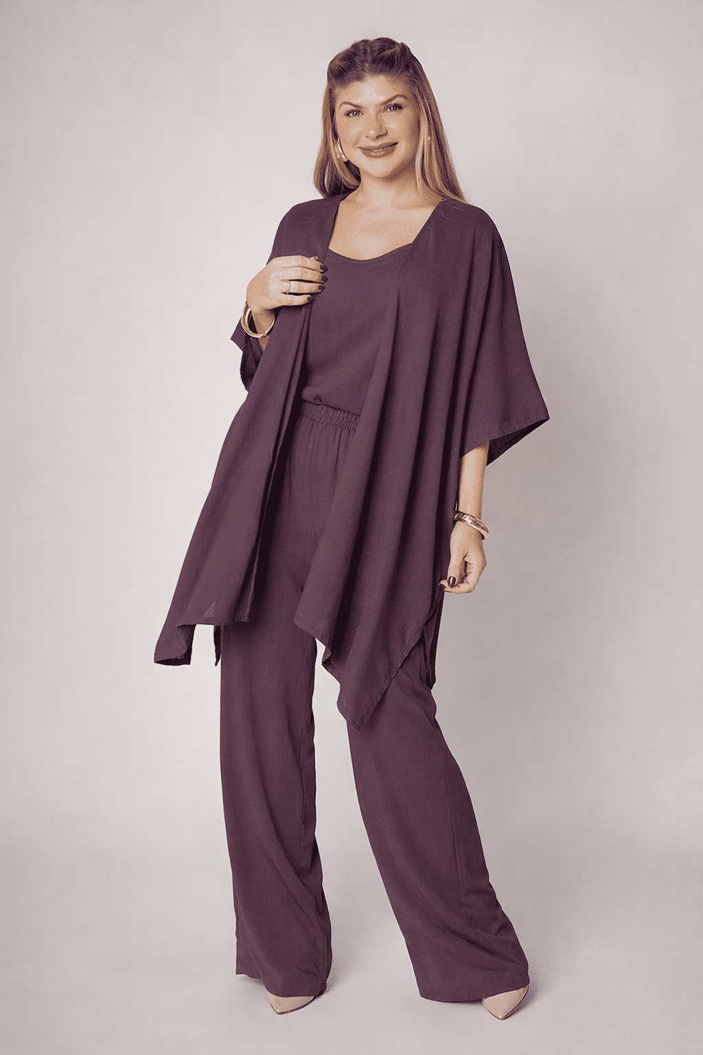 Sabe aquela peça que chega para transformar seus looks com leveza e estilo? Esse é o Kimono Eli! Um modelo versátil e moderno, com caimento fluido e detalhes que dão um toque elegante e descontraído ao seu visual, ideal para o clima brasileiro.