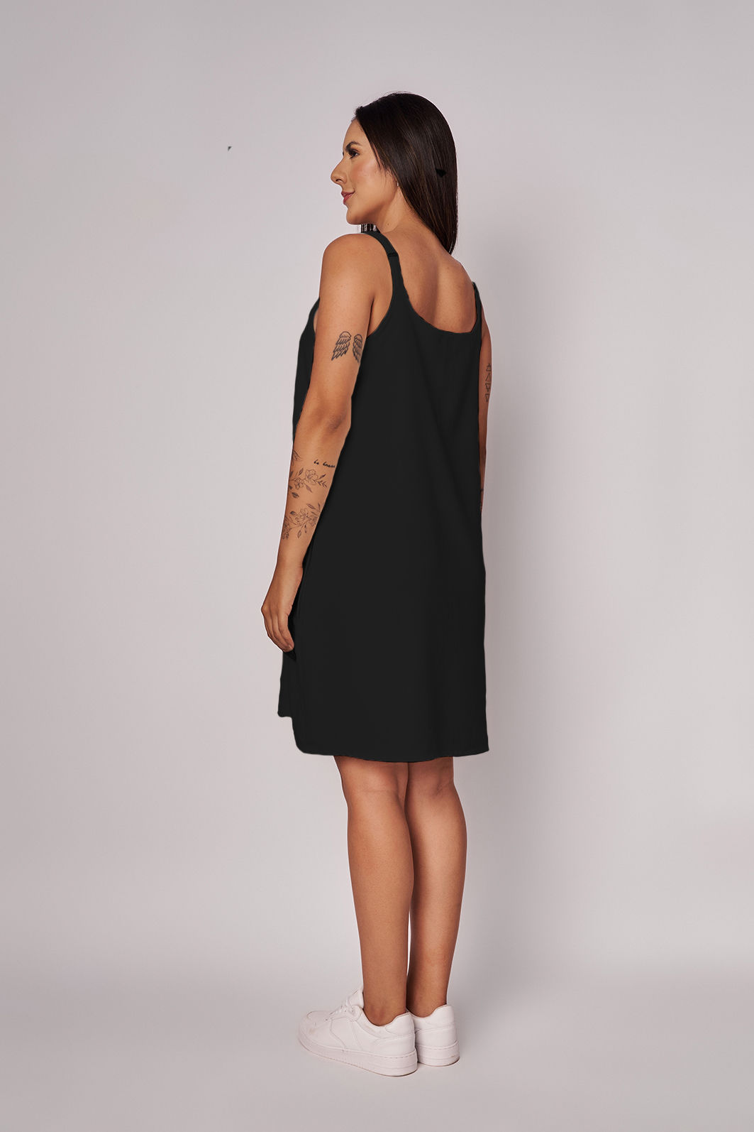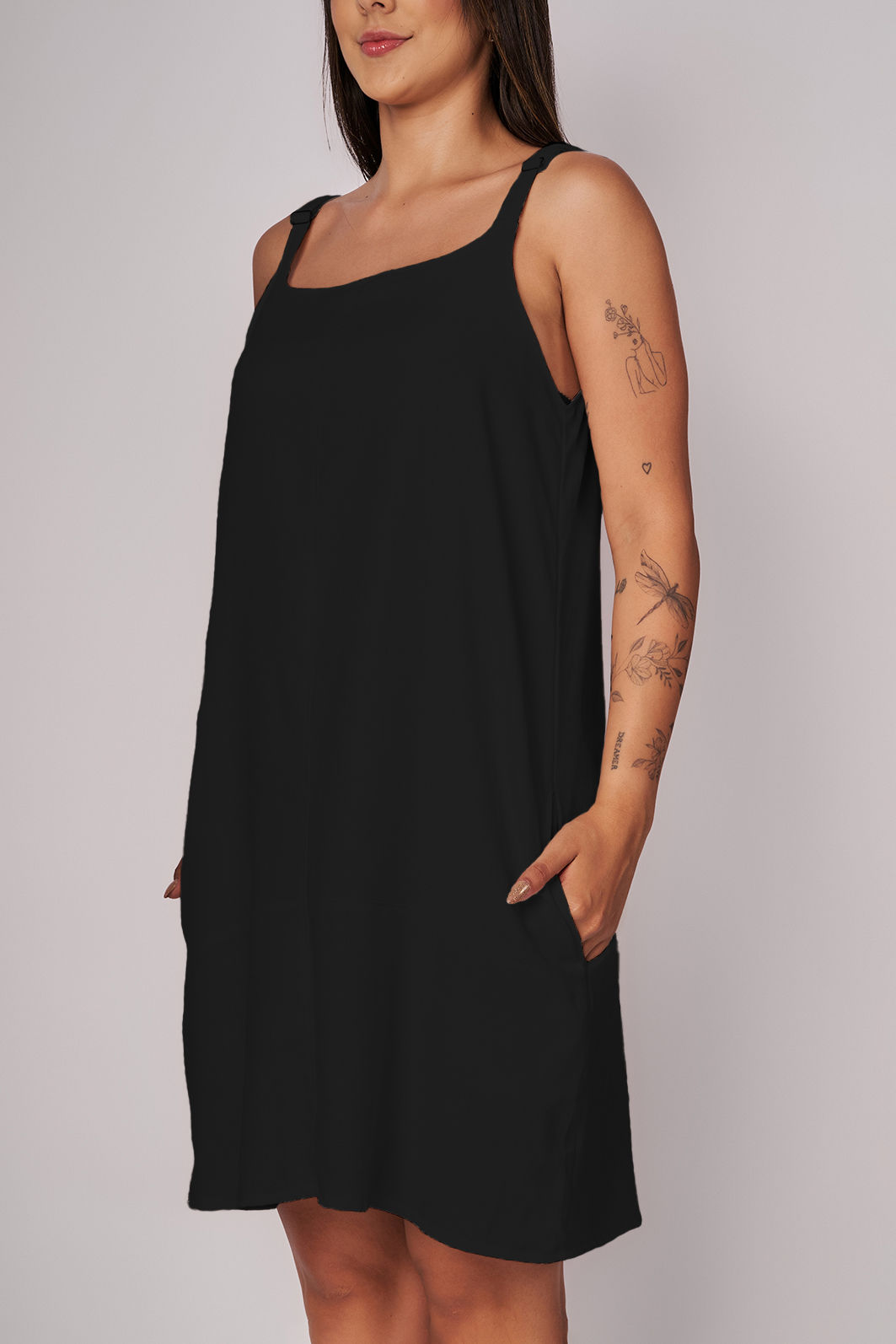 Vestido curto, com bolsos faca laterais, com alças largas e reguladores, pespontos na frente, produzido em tecido de linho e viscose.