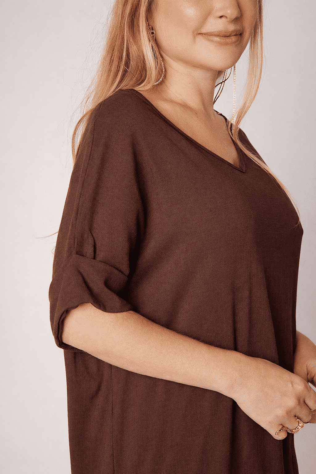 O tecido de viscose com elastano tem um toque super macio e caimento fluido, sendo respirável e ideal pra o clima brasileiro. Ele também tem uma baixa tendência a amassar, mantendo seu caimento impecável por mais tempo e te dando mais praticidade.