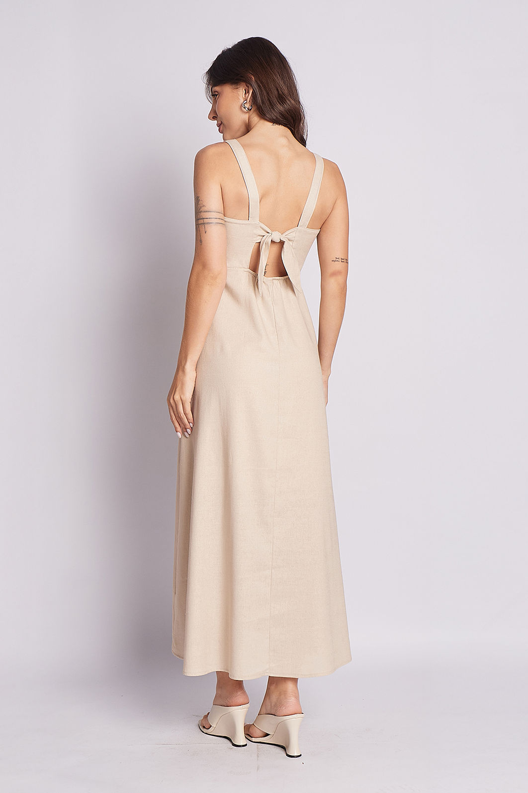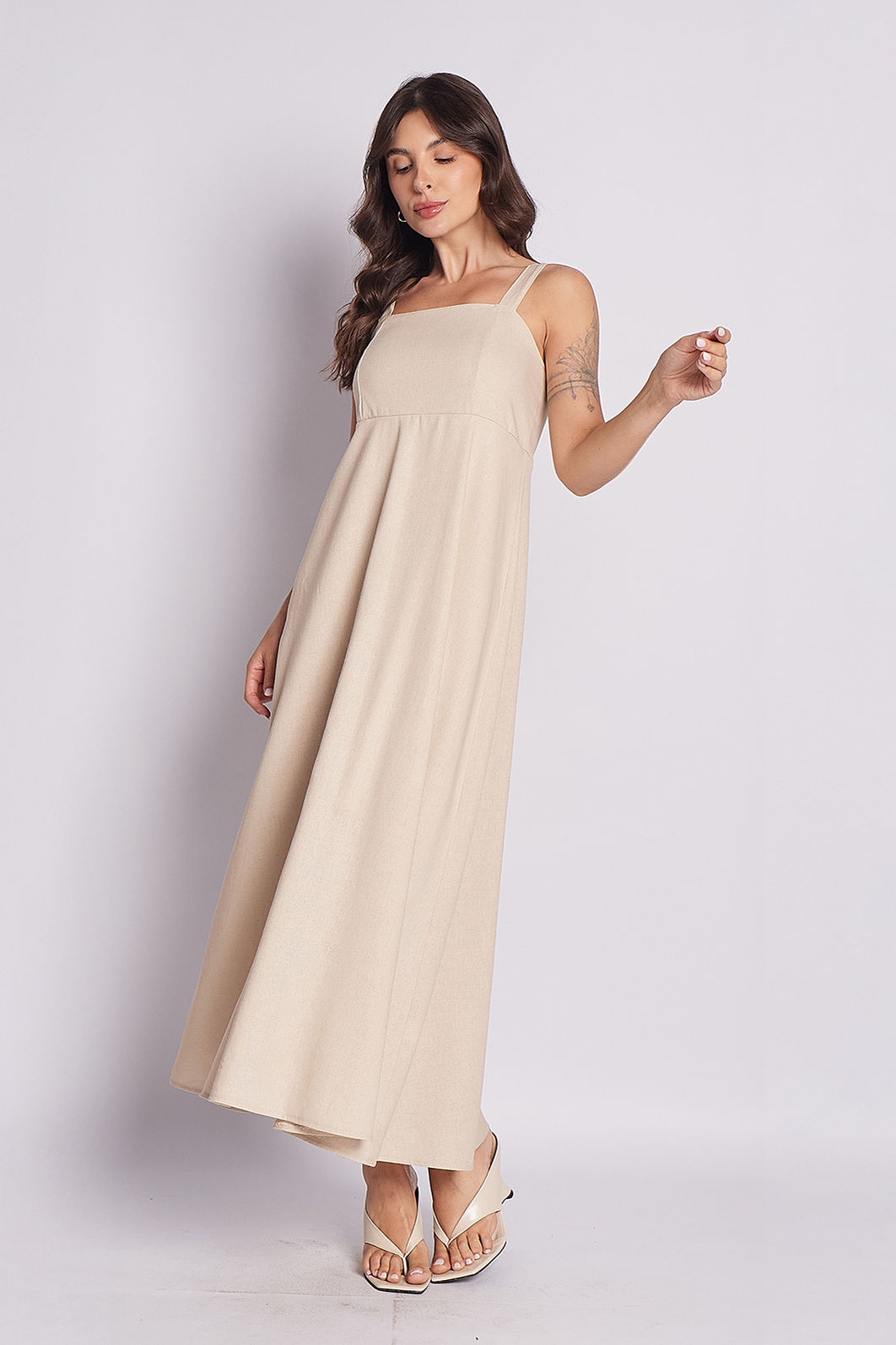 Busto forrado com ajuste nas costas se adapta ao corpo e valoriza o colo com delicadeza, sem apertar.